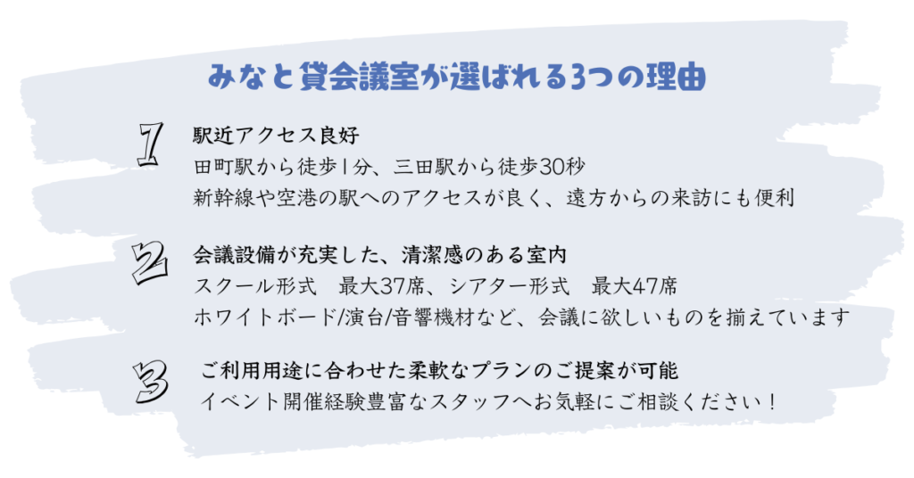都営三田線/浅草線「三田駅」A7出口より徒歩30秒JR山手線「田町駅」三田口(西口)より徒歩1分